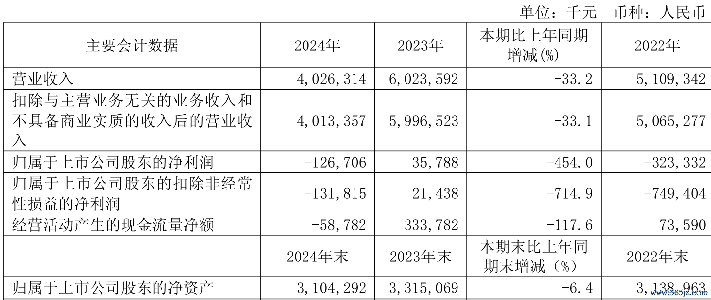 中证智能财讯卓郎智能(600545)4月29日披露2024年年度报告。2024年,公司实现营业总收入40.26亿元,同比下降33.16%;归母净利润亏损1.27亿元,上年同期盈利3578.8万元;扣非净利润亏损1.32亿元,上年同期盈利2143.8万元;经营活动产生的现金流量净额为-5878.2万元,上年同期为3.34亿元;报告期内,卓郎智能基本每股收益为-0.0709元,加权平均净资产收益率为-3.95%。