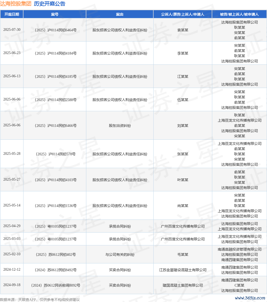 案号:(2025)沪0114民初6466号审理法院:上海市嘉定区人民法院案由:股东出资纠纷当事人信息: 原告/上诉人:刘某某 被告/被上诉人:耿某某、上海亘龙文化传播有限公司、俞某某、达海控股集团有限公司、宋某某开庭日期:2025年6月6日根据统计,近一年内以达海控股集团有限公司为当事人的历史开庭公告有13则,其中案由为“股东损害公司债权人利益责任纠纷”的公告以7则居首,其次为“买卖合同纠纷”有2则,“承揽合同纠纷”有2则。历史开庭公告如下: