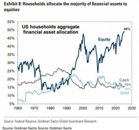 策略师补充道,美国人目前将49%的金融资产配置于股票,创历史最高水平,超过2000年48%的前峰值。这与其他地区形成鲜明对比:欧元区家庭仅10%资产配置股票,日本更是只有13%。